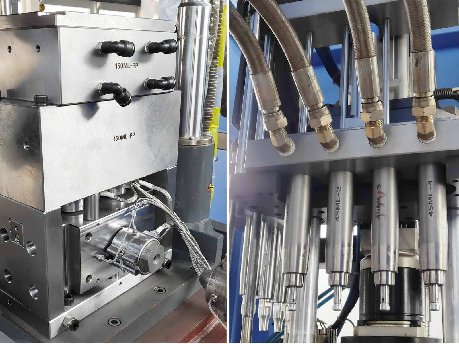 Máquinas de moldagem por estiramento de estiramento de animais totalmente automáticos (pré-aquecimento). Possui 3 a 16 cavidades e a capacidade máxima dos produtos é de 2000 ml. Ele pode soprar garrafas em formas: carbonatada, mineral, pesticida, cosméticos, boca larga, recheio a quente e outros recipientes de embalagem, que são feitos de plástico do tipo cristalino, como PET e PP etc.