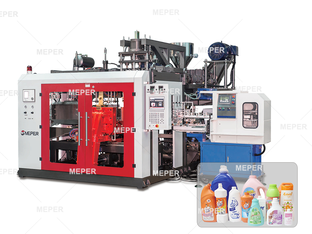 Máquina de moldagem por sopro de extrusão MEPER O MP80FS IML é projetado especificamente para fabricar garrafas de 5 ml até o máximo 10L. É acionado hidráulico com o sistema de controle eletrical Acrate. O MP80FS IML possui estações duplas para aumentar a eficiência da produção. Além disso, ele tem uma variedade de opções de cabeças. Com mais de 10 anos de sucesso no mercado, o MP80FS IML é atualizado para ser um dos modelo mais confiável e popular do mundo.